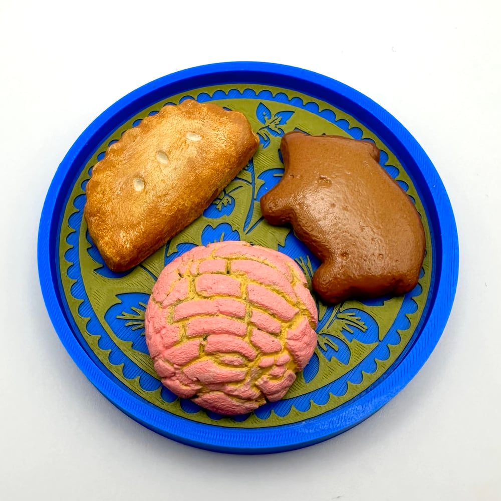 4 magnets. Qty 1) 2.75" platter Qty 1) 1.5" Cochito Qty 1) 1.5" Empanada Qty 1) 1" Concha. All parts are 3D printed. Pastries are hand painted. Blue and olive platter. 4 designs to choose from.