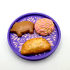 4 magnets. Qty 1) 2.75" platter Qty 1) 1.5" Cochito Qty 1) 1.5" Empanada Qty 1) 1" Concha. All parts are 3D printed. Pastries are hand painted. Purple and pink platter. 4 designs to choose from.